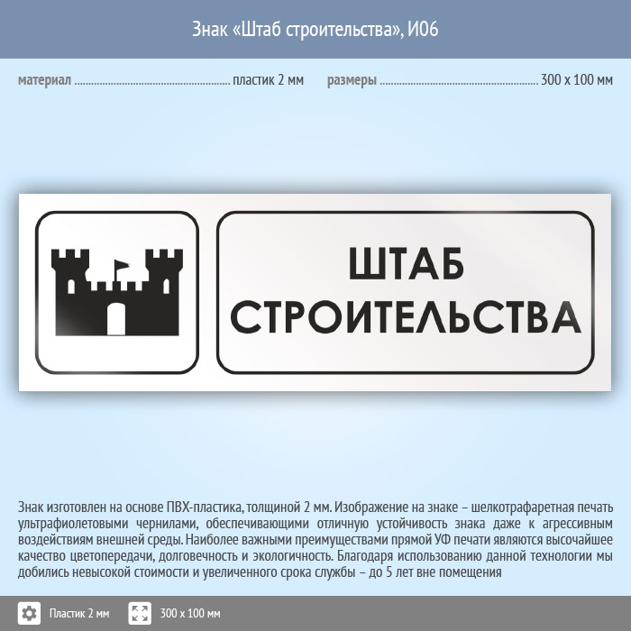 Знак «Штаб строительства», И06 (пластик, 300х100 мм) в Верее купить