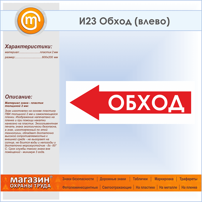 Знак «Обход (влево)», И23 (пластик, 600х200 мм) в Верее купить