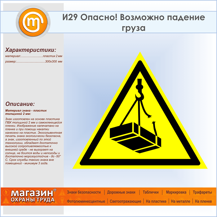 Знак «Опасно! Возможно падение груза», И29 (пластик, сторона 300 мм) в Верее купить