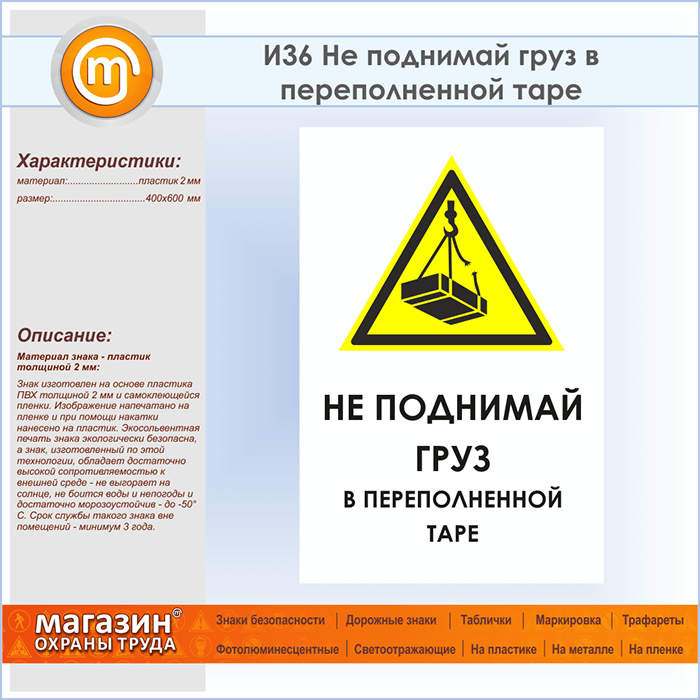 Знак «Не поднимай груз в переполненной таре», И36 (пластик, 400х600 мм) в Верее купить