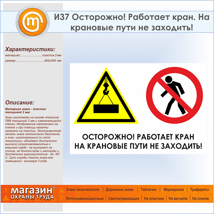 Знак «Осторожно! Работает кран. На крановые пути не заходить!», И37 (пластик, 600х400 мм) в Верее купить