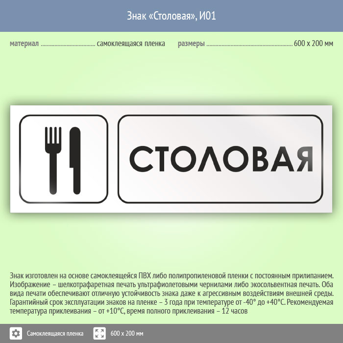 Знак «Столовая», И01 (пленка, 600х200 мм) в Верее купить