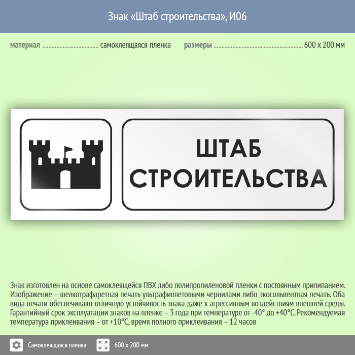 Знак «Штаб строительства», И06 (пленка, 600х200 мм) в Верее купить