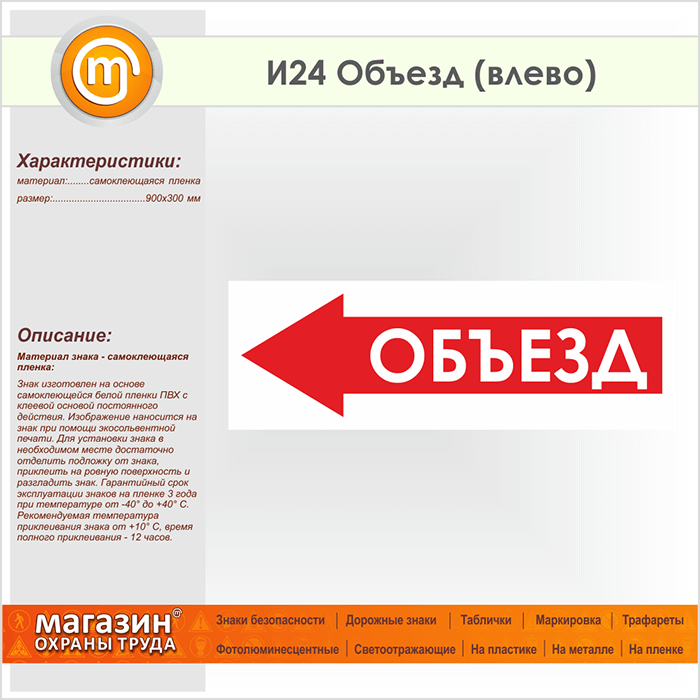Знак «Объезд (влево)», И24 (пленка, 900х300 мм) в Верее купить
