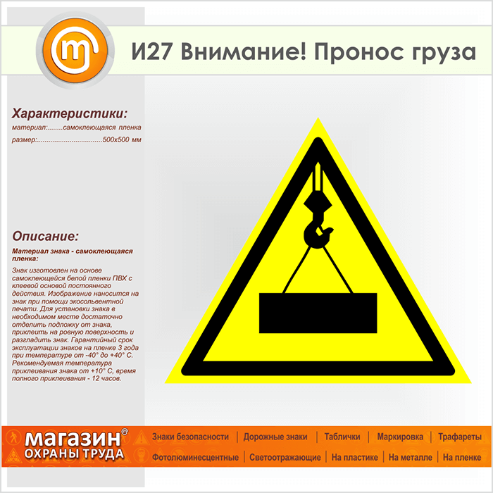 Знак «Внимание! Пронос груза», И27 (пленка, сторона 500 мм) в Верее купить