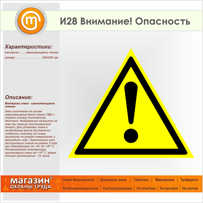 Знак «Внимание! Опасность», И28 (пленка, сторона 500 мм) в Верее купить