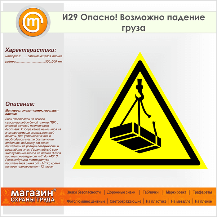 Знак «Опасно! Возможно падение груза», И29 (пленка, сторона 500 мм) в Верее купить