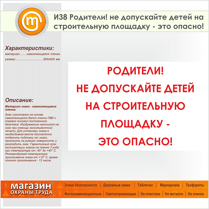 Знак «Родители! не допускайте детей на строительную площадку - это опасно!», И38 (пленка, 900х600 мм) в Верее купить