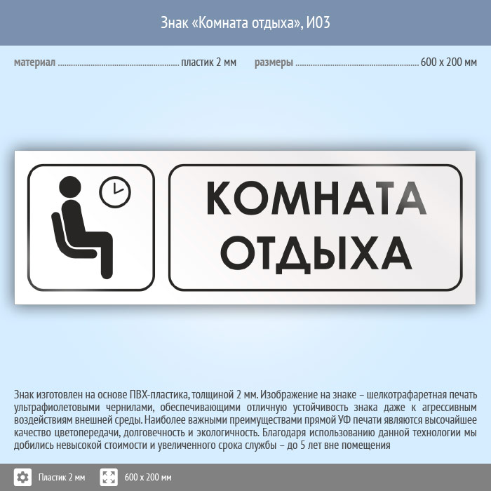 Знак «Комната отдыха», И03 (пластик, 600х200 мм) в Верее купить