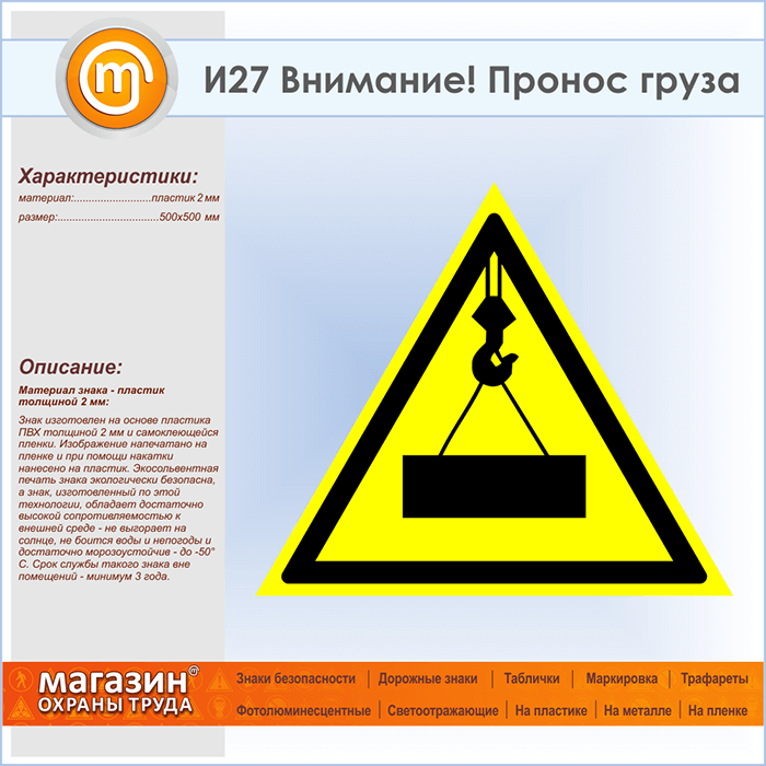 Знак «Внимание! Пронос груза», И27 (пластик, сторона 500 мм) в Верее купить