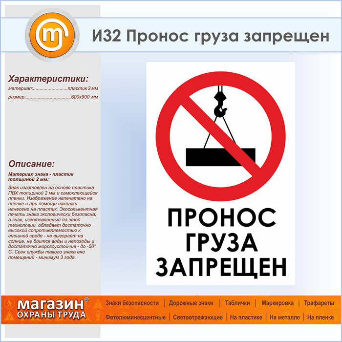 Знак «Пронос груза запрещен», И32 (пластик, 600х900 мм) в Верее купить