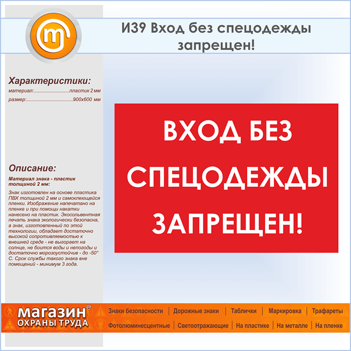 Знак «Вход без спецодежды запрещен!», И39 (пластик, 900х600 мм) в Верее купить