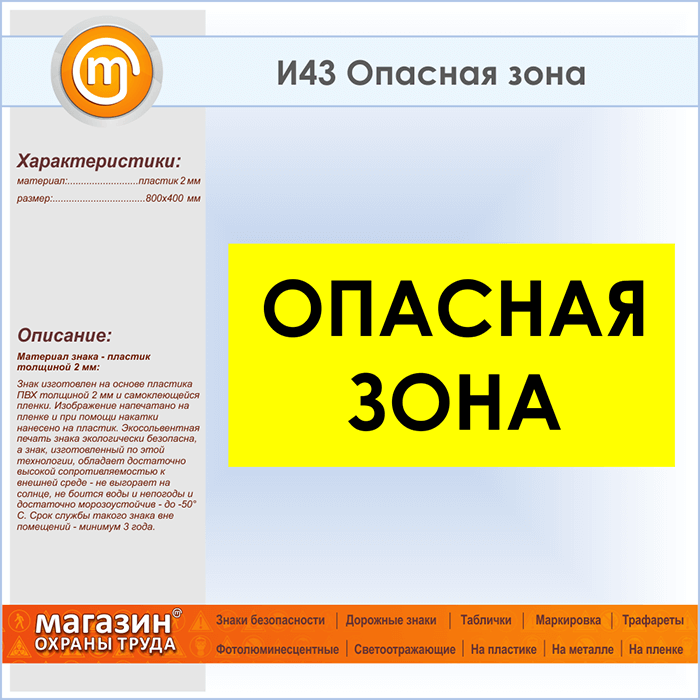 Знак «Опасная зона», И43 (пластик, 800х400 мм) в Верее купить