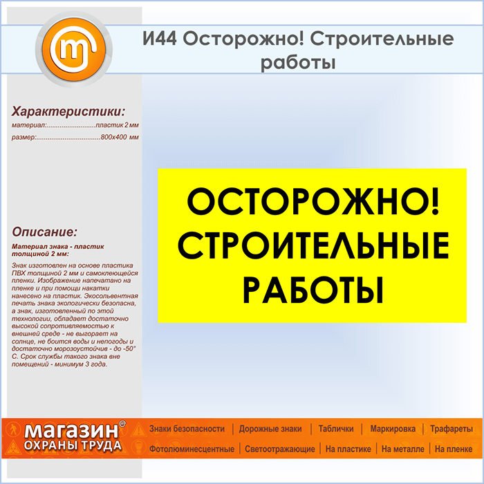 Знак «Осторожно! Строительные работы», И44 (пластик, 800х400 мм) в Верее купить