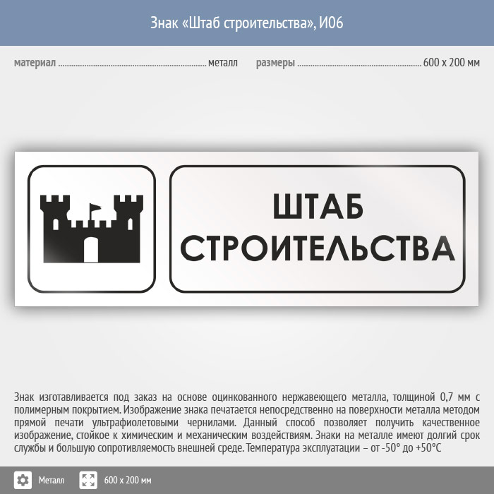 Знак «Штаб строительства», И06 (металл, 600х200 мм) в Верее купить