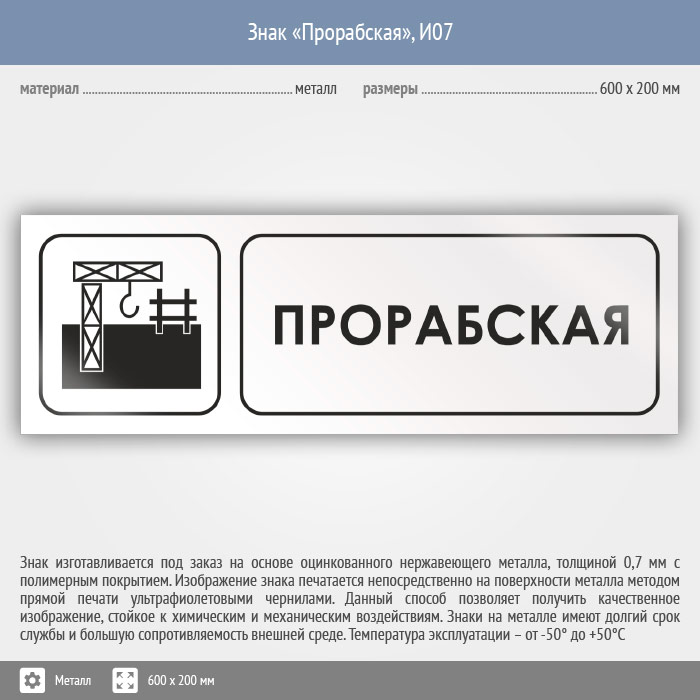 Знак «Прорабская», И07 (металл, 600х200 мм) в Верее купить