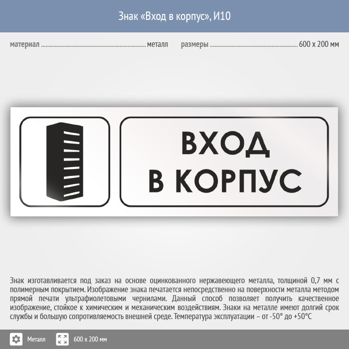 Знак «Вход в корпус», И10 (металл, 600х200 мм) в Верее купить
