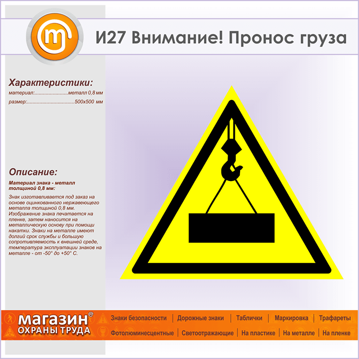 Знак «Внимание! Пронос груза», И27 (металл, сторона 500 мм) в Верее купить