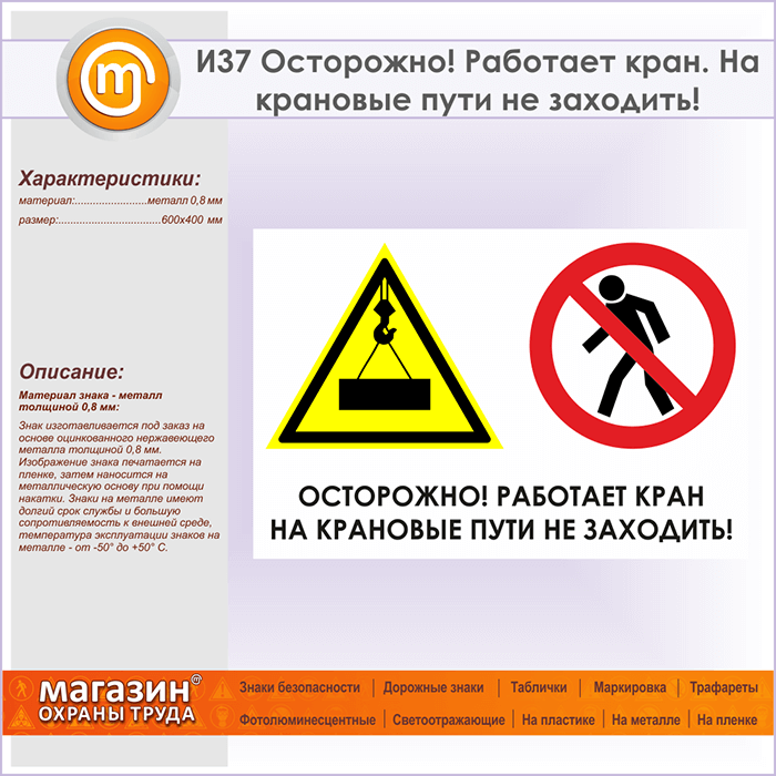 Знак «Осторожно! Работает кран. На крановые пути не заходить!», И37 (металл, 600х400 мм) в Верее купить