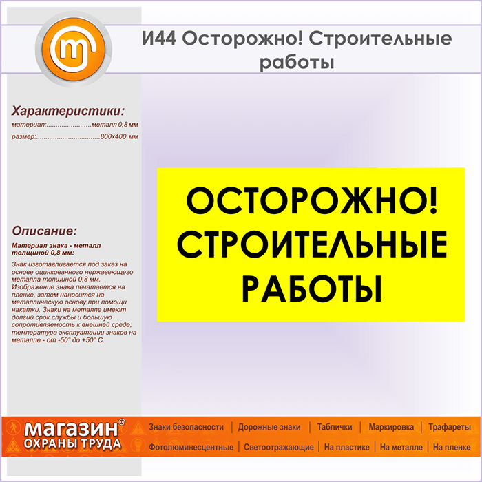 Знак «Осторожно! Строительные работы», И44 (металл, 800х400 мм) в Верее купить