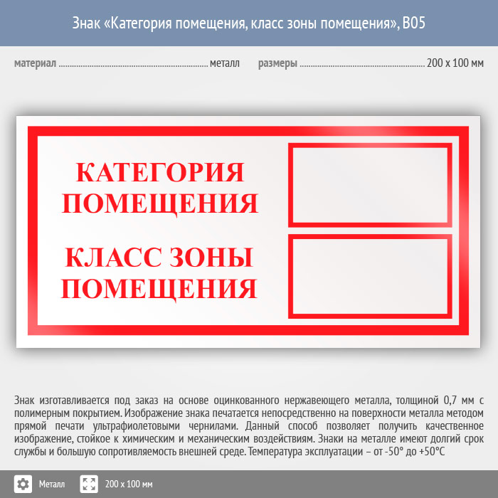 Знак «Категория помещения, класс зоны помещения», B05 (металл, 200х100 мм) в Верее купить