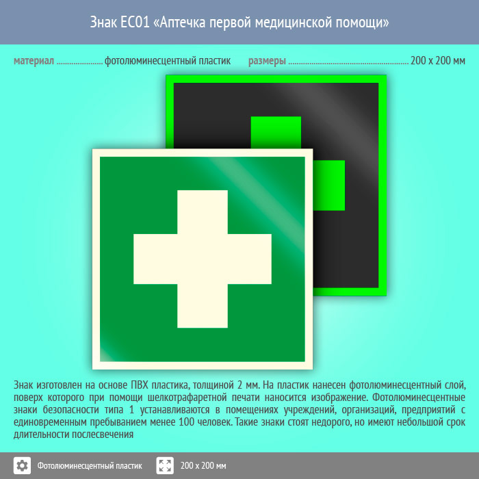 Знак EC01 «Аптечка первой медицинской помощи» (фотолюминесцентный пластик, 200х200 мм) в Верее купить