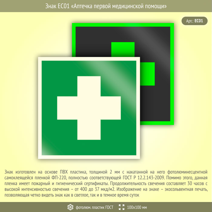 Знак EC01 «Аптечка первой медицинской помощи» (фотолюминесцентный пластик ГОСТ 34428-2018, 100х100 мм) в Верее купить