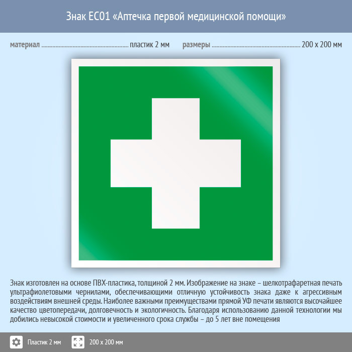 Знак EC01 «Аптечка первой медицинской помощи» (пластик, 200х200 мм) в Верее купить