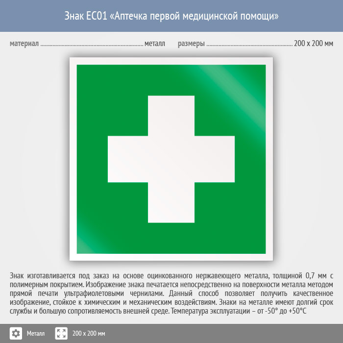 Знак EC01 «Аптечка первой медицинской помощи» (металл, 200х200 мм) в Верее купить
