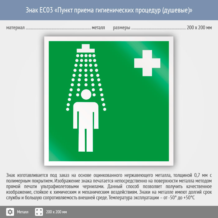 Знак EC03 «Пункт приема гигиенических процедур (душевые)» (металл, 200х200 мм) в Верее купить