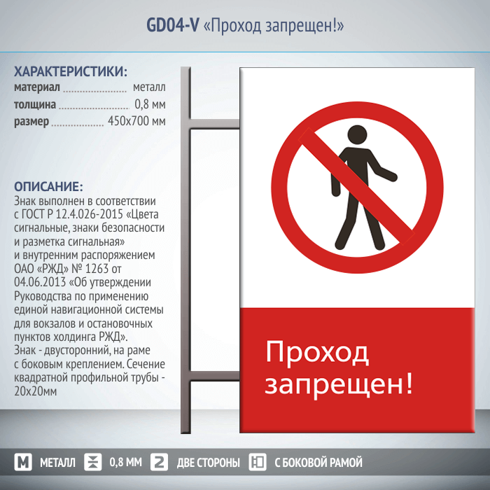 Знак «Проход запрещен!», GD04-V (двусторонний вертикальный, 450х700 мм, металл, на раме с боковым креплением) в Верее купить