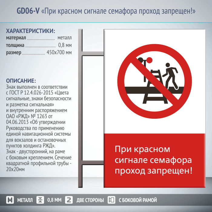 Знак «При красном сигнале семафора проход запрещен!», GD06-V (двусторонний вертикальный, 450х700 мм, металл, на раме с боковым креплением) в Верее купить