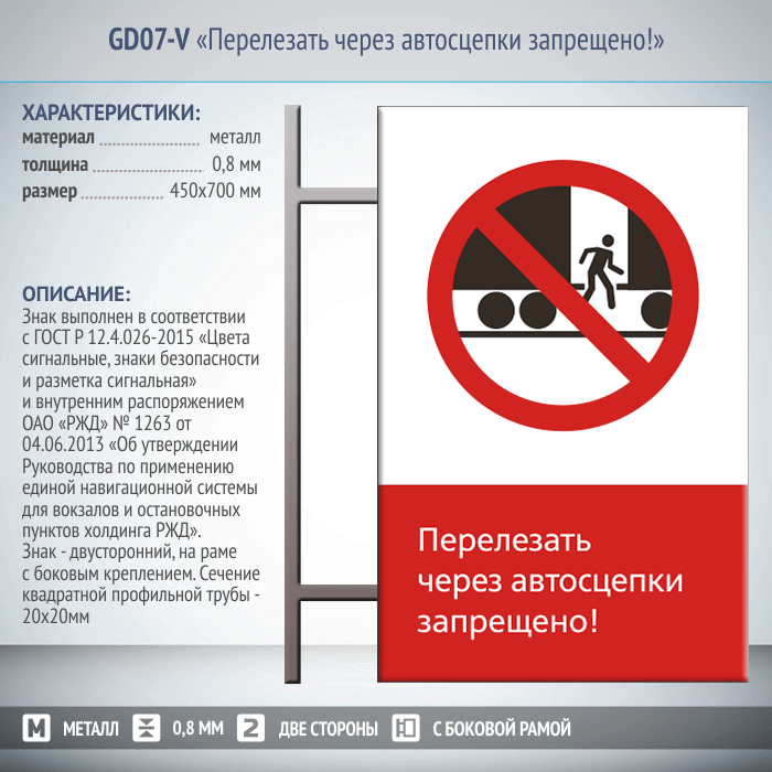 Знак «Перелезать через автосцепки запрещено!», GD07-V (двусторонний вертикальный, 450х700 мм, металл, на раме с боковым креплением) в Верее купить