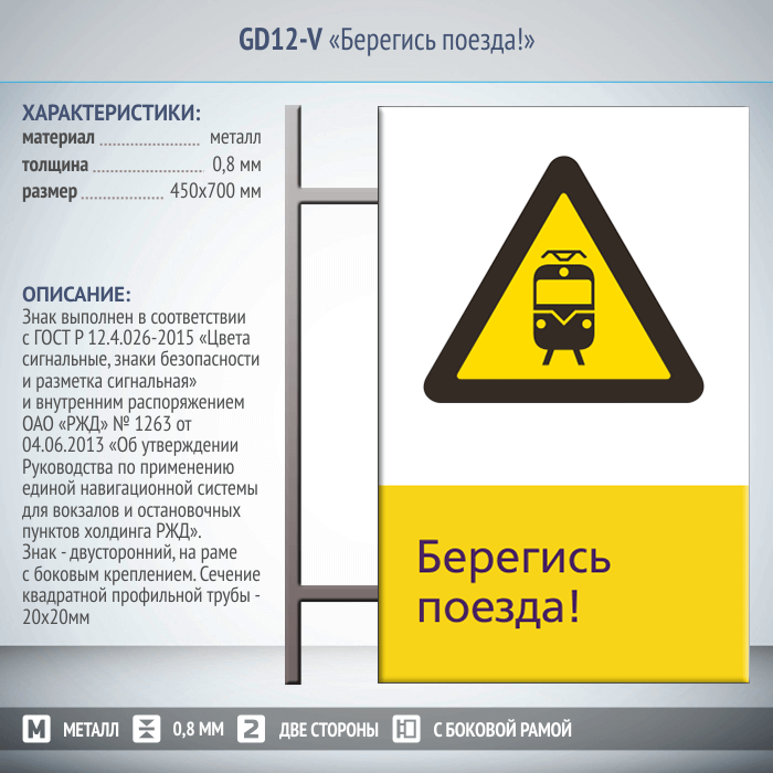 Знак «Берегись поезда!», GD12-V (двусторонний вертикальный, 450х700 мм, металл, на раме с боковым креплением) в Верее купить