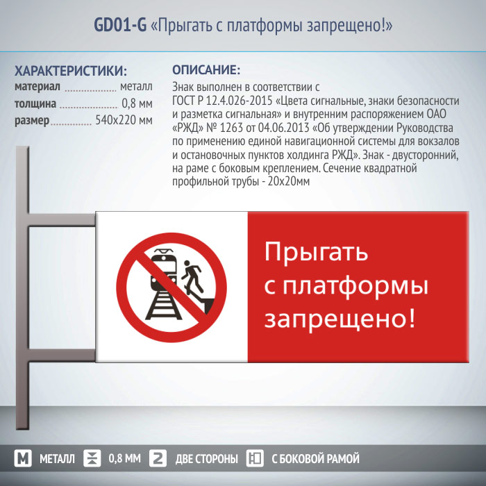 Знак «Прыгать с платформы запрещено!», GD01-G (двусторонний горизонтальный, 540х220 мм, металл, на раме с боковым креплением) в Верее купить