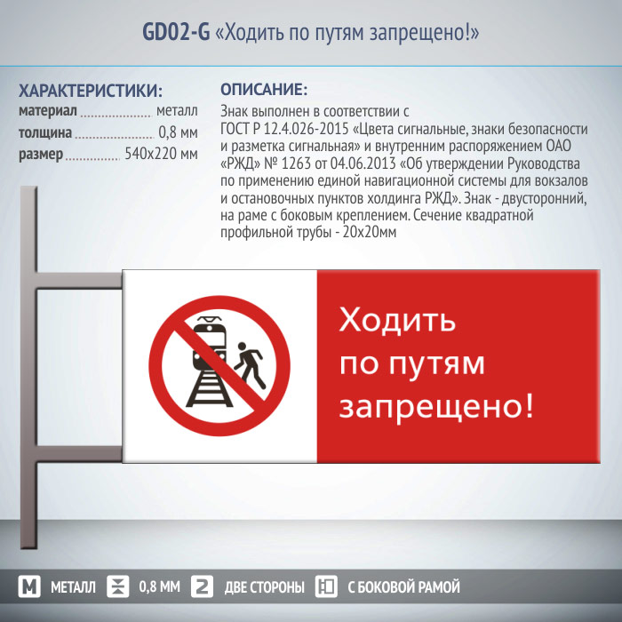 Знак «Ходить по путям запрещено!», GD02-G (двусторонний горизонтальный, 540х220 мм, металл, на раме с боковым креплением) в Верее купить