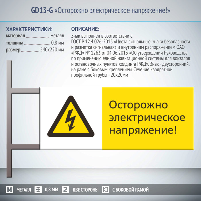 Знак «Осторожно электрическое напряжение!», GD13-G (двусторонний горизонтальный, 540х220 мм, металл, на раме с боковым креплением) в Верее купить