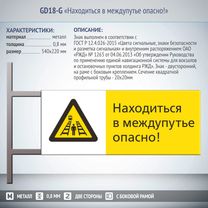Знак «Находиться в междупутье опасно!», GD18-G (двусторонний горизонтальный, 540х220 мм, металл, на раме с боковым креплением) в Верее купить