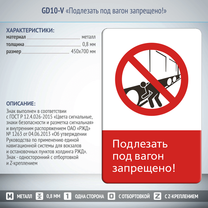 Знак «Подлезать под вагон запрещено!», GD10-V (односторонний вертикальный, 450х700 мм, металл, с отбортовкой и Z-креплением) в Верее купить