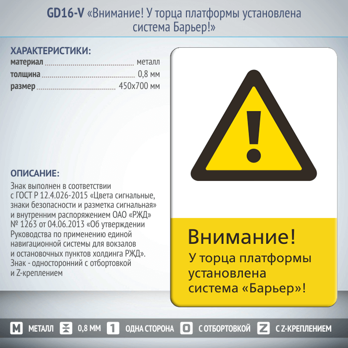 Знак «Внимание! У торца платформы установлена система Барьер!», GD16-V (односторонний вертикальный, 450х700 мм, металл, с отбортовкой и Z-креплением) в Верее купить