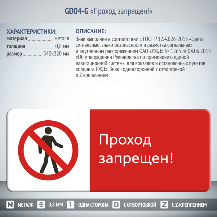 Знак «Проход запрещен!», GD04-G (односторонний горизонтальный, 540х220 мм, металл, с отбортовкой и Z-креплением) в Верее купить