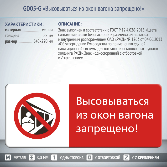 Знак «Высовываться из окон вагона запрещено!», GD05-G (односторонний горизонтальный, 540х220 мм, металл, с отбортовкой и Z-креплением) в Верее купить