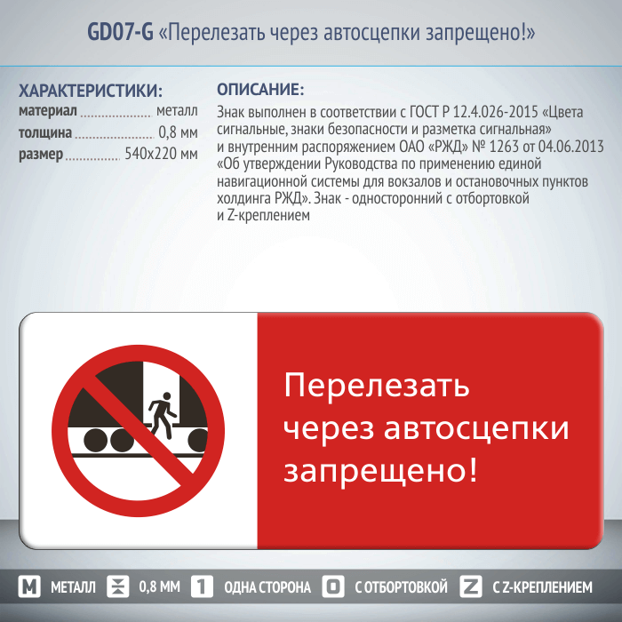 Знак «Перелезать через автосцепки запрещено!», GD07-G (односторонний горизонтальный, 540х220 мм, металл, с отбортовкой и Z-креплением) в Верее купить