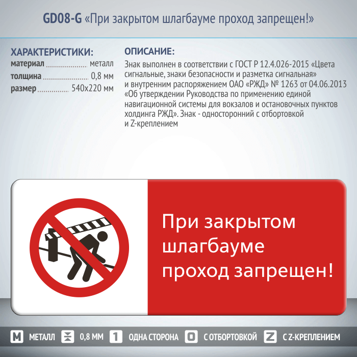 Знак «При закрытом шлагбауме проход запрещен!», GD08-G (односторонний горизонтальный, 540х220 мм, металл, с отбортовкой и Z-креплением) в Верее купить