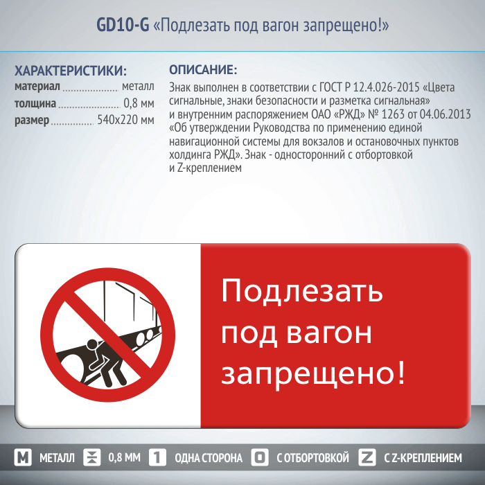 Знак «Подлезать под вагон запрещено!», GD10-G (односторонний горизонтальный, 540х220 мм, металл, с отбортовкой и Z-креплением) в Верее купить