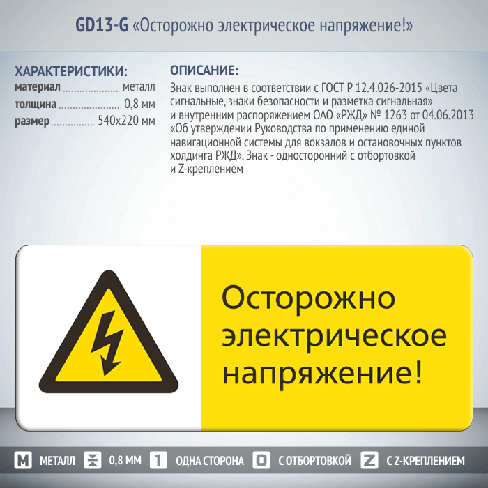 Знак «Осторожно электрическое напряжение!», GD13-G (односторонний горизонтальный, 540х220 мм, металл, с отбортовкой и Z-креплением) в Верее купить