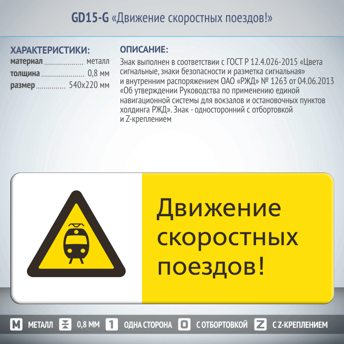 Знак «Движение скоростных поездов!», GD15-G (односторонний горизонтальный, 540х220 мм, металл, с отбортовкой и Z-креплением) в Верее купить