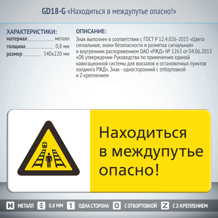 Знак «Находиться в междупутье опасно!», GD18-G (односторонний горизонтальный, 540х220 мм, металл, с отбортовкой и Z-креплением) в Верее купить