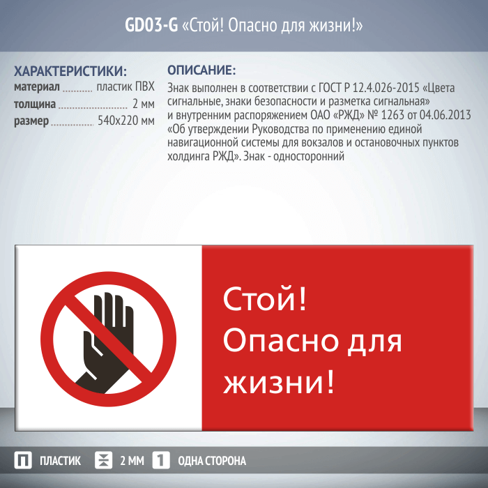 Знак «Стой! Опасно для жизни!», GD03-G (односторонний горизонтальный, 540х220 мм, пластик 2 мм) в Верее купить
