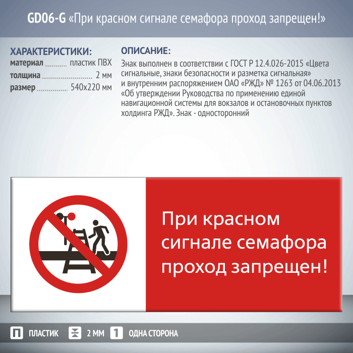 Знак «При красном сигнале семафора проход запрещен!», GD06-G (односторонний горизонтальный, 540х220 мм, пластик 2 мм) в Верее купить